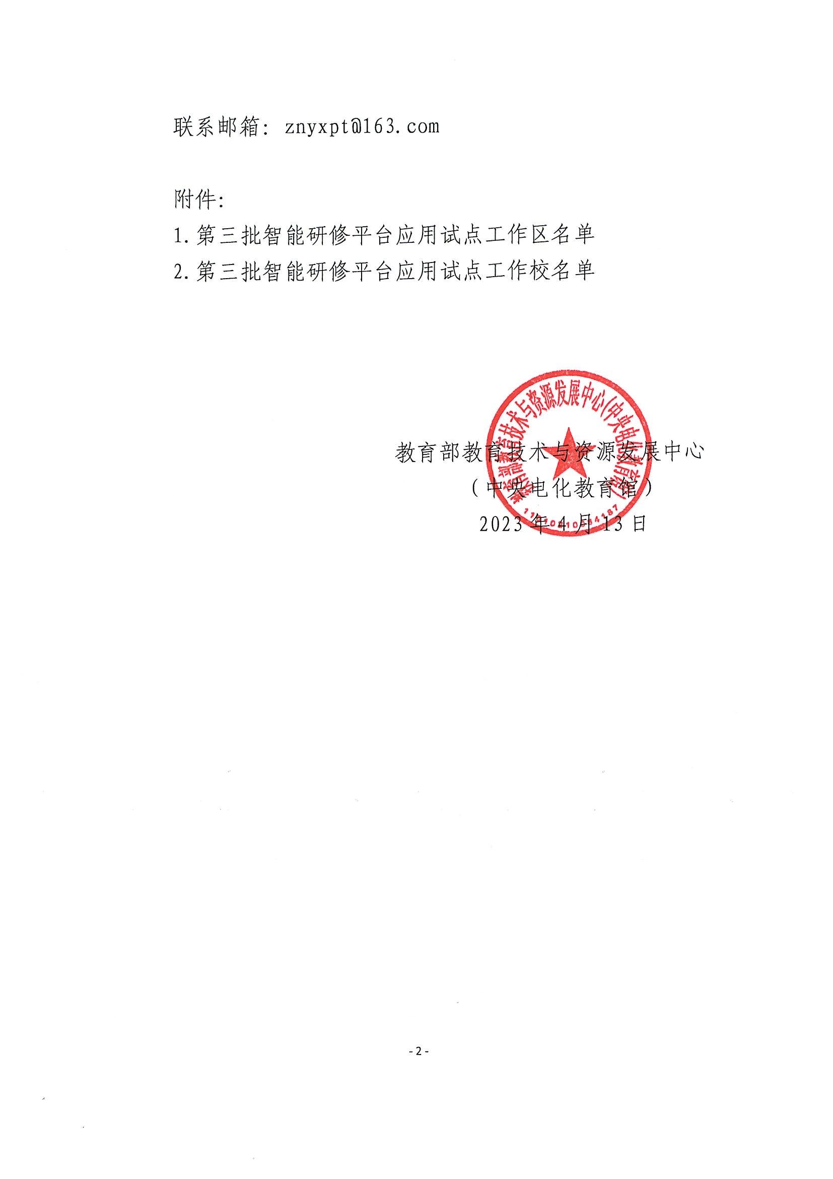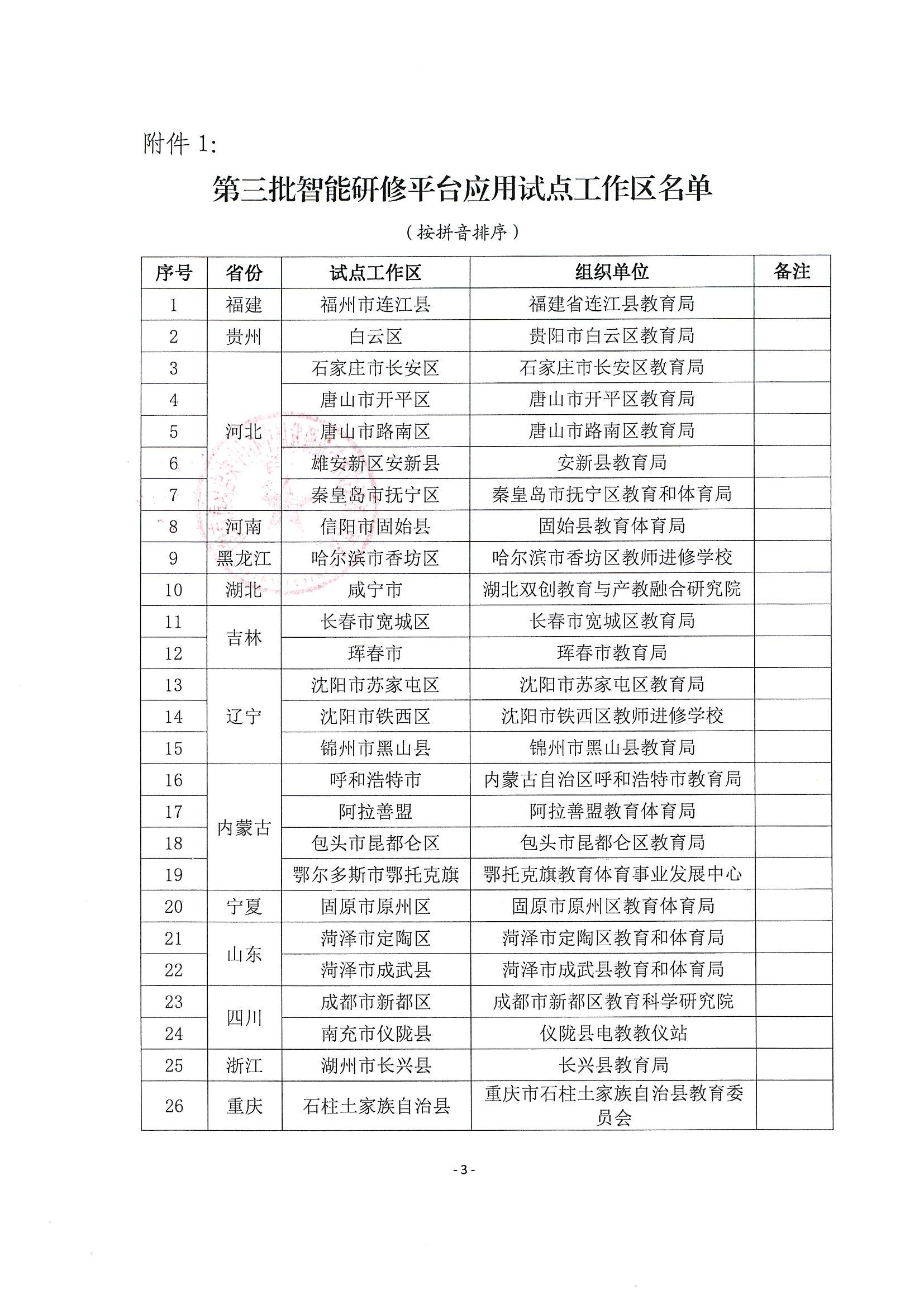 按照《教育部教育技术与资源发展中心(中央电化教育馆)关于遴选第三批智能研修平台应用试点工作区和学校的通知》要求,各地积极响应,在自愿申报、省级电教部门推荐的基础上,教育部教育技术与资源发展中心(中央电化教育馆)组织审核并确定了福建省连江县教育局等26个地区为第三批试点工作区,安徽淮南第一中学等100个学校为第三批试点工作校。