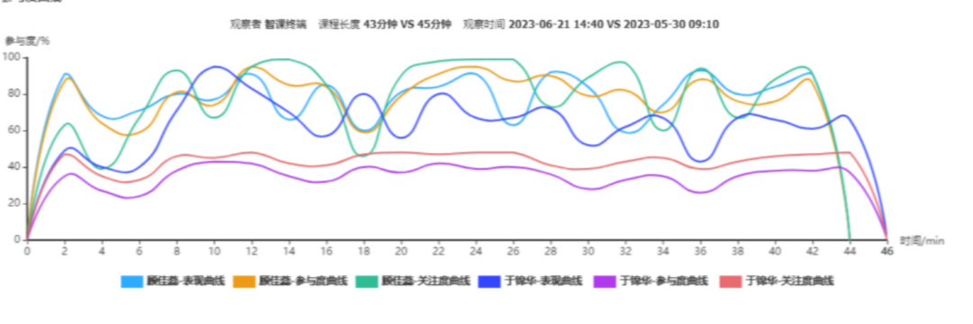 从参与度曲线、表现曲线、关注度曲线来看,佳蕊老师这节课三条线数值都高于锦华老师这节课。实际上,锦华老师的这节课平台的数据显示为混合型的课,接近讲授型;佳蕊的课平台的数据显示为讲授型。由于不同教师授课,课堂的特点不完全相同,而央馆智能研修平台只能以一种固定的方法来计算关注度和参与度,并以此为基础来绘制关注度曲线和参与度曲线。所以,在这里需要结合课堂回放来研究课堂参与度曲线和关注度曲线所代表的意义。